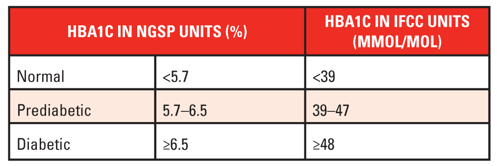 | Prediabetes | 5.7% to 6.4% |
