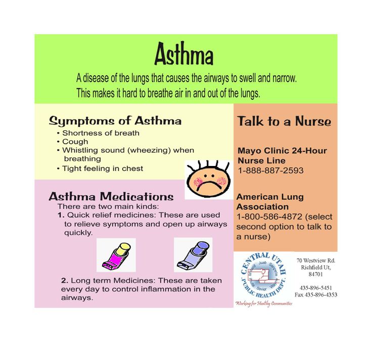 - Табачный дым: Если вы или кто-то из членов вашей семьи курит, у вас повышается риск развития астмы. Вы никогда не должны курить в закрытых помещениях, таких как машина или дом, и лучшее решение — бросить курить. Ваш провайдер может помочь.
