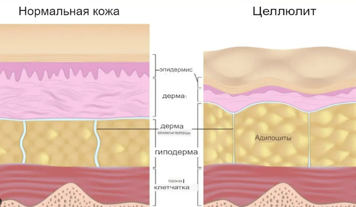 In fact, as well as on the body, we see 2 processes arising one from the other. There are dystrophic changes in the subcutaneous fat, part of the adipocytes (the cells that make up the adipose tissue) slowly die and as a result – apoptosis (cell self-destruction). In their place, connective tissue grows (visually, in this place we see a kind of retraction), which further aggravates lymphostasis (tissue swelling). The walls of the lymphatic vessel become thinner, which leads to dystrophy (damage) of other cells – this is how a pathological circle is formed and, so “hated” by all women, bumps and bumps on the skin.
