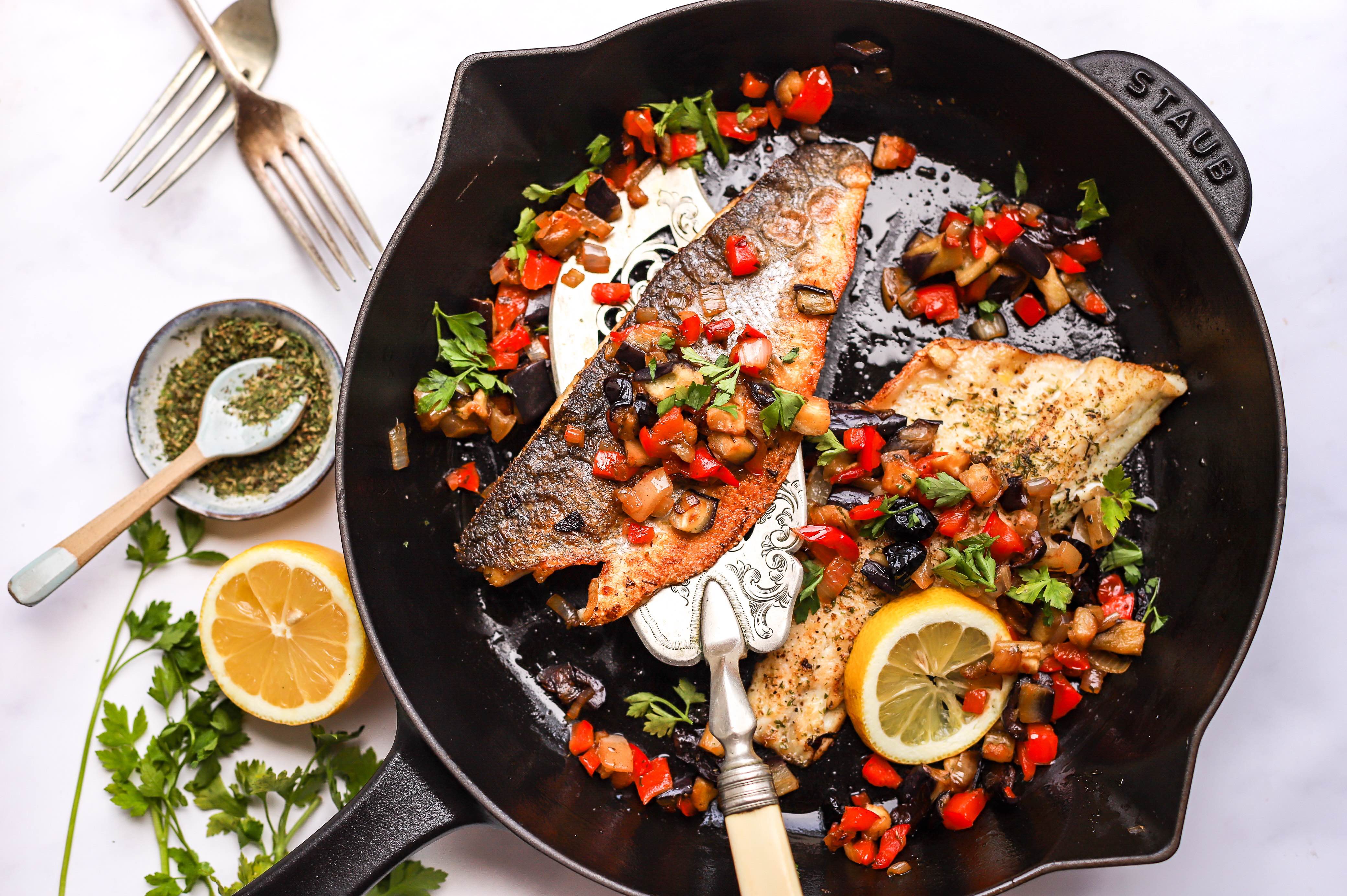 Dinner: white fish, eggs and spinach cooked in olive oil.