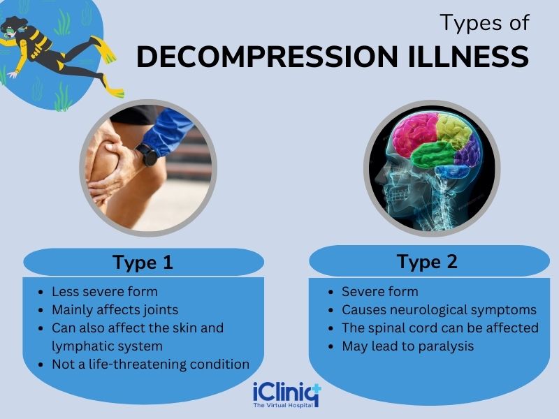 Decompression sickness is categorized into Type I and Type II: